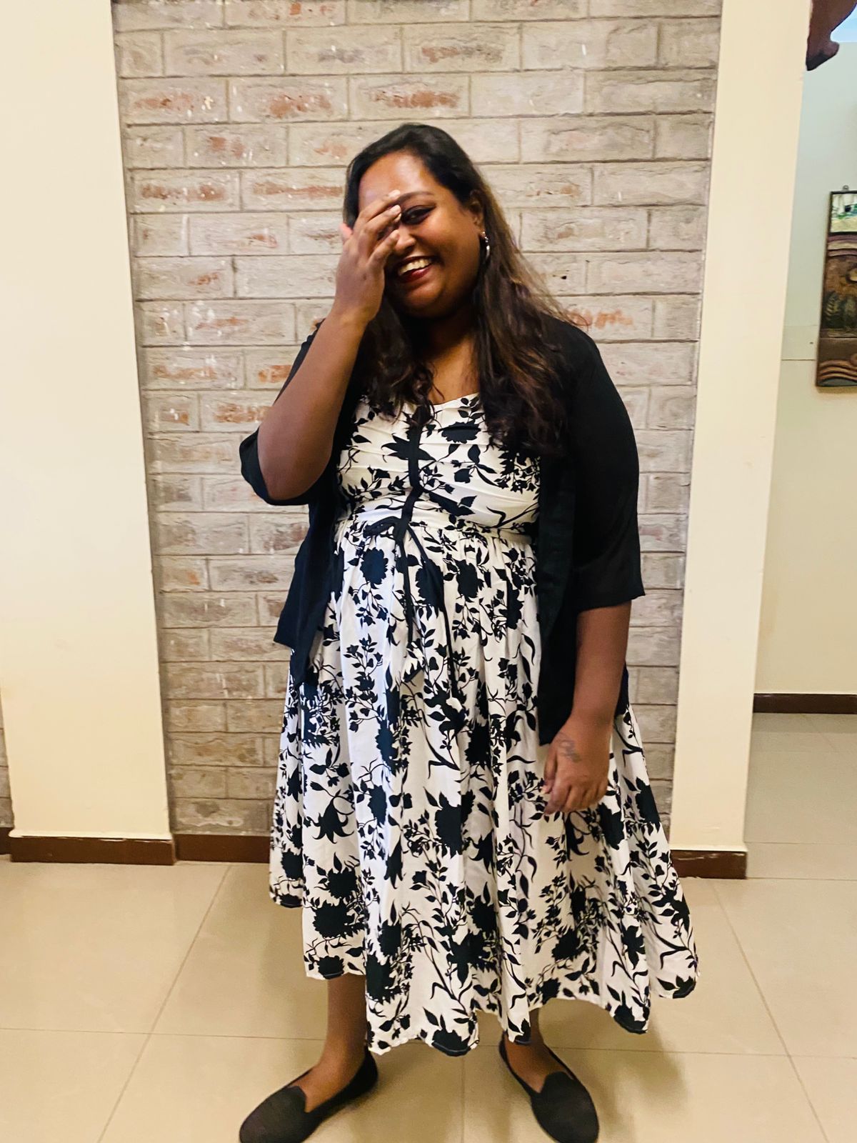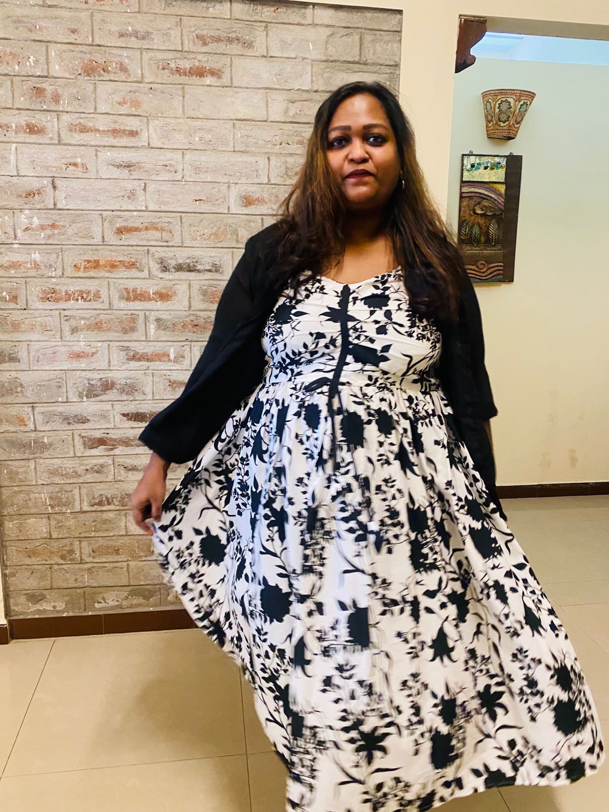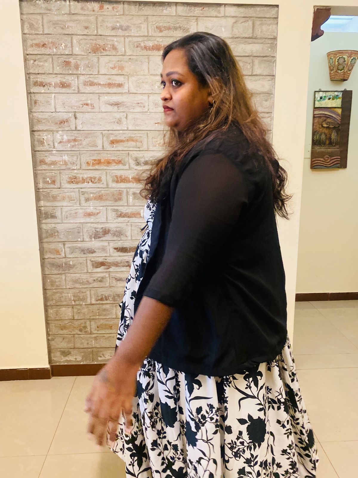 After lunch, me and the rest of the gang (Sushma & Sai) bid adieu to Kavya, wished her a happy married life and headed back to the service apartment. From there everyone was going their separate ways. I decided to head to my uncle’s house since he already knew I was in Madurai and he’d definitely be hurt if I didn’t go visit them. Also, I haven’t booked my return ticket. So I decided to stay the night there at his place and then head home the next day. I slipped into the other dress that I had because I was feeling very uncomfortable in saree. This dress is a sleeveless black & white western wear with a plain georgette black shrug. This dress was custom made from one of the instagram pages I followed.